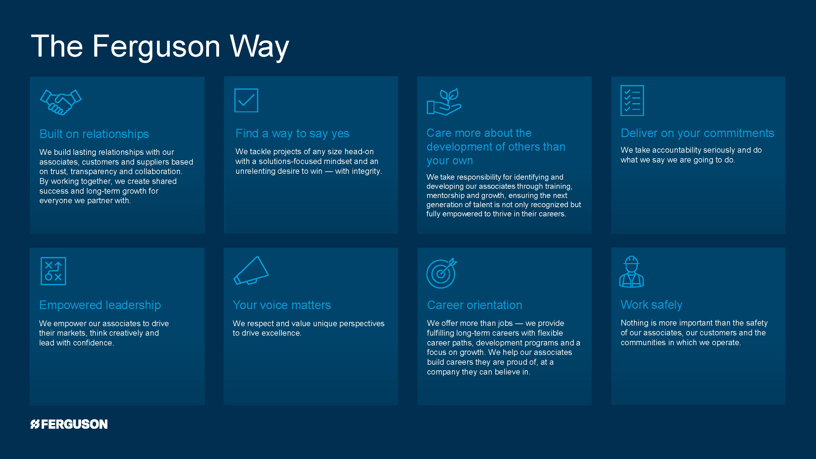 We provide expertise and a wide range of products and services from plumbing, HVAC, appliances, and lighting to PVF, water and wastewater solutions, and more. Our associates are the driving force of the business and a key differentiator in how we achieve our purpose and create value. They are guided by The Ferguson Way and our Vision which serve as a reminder of the goals we are working towards and how we expect to get there.